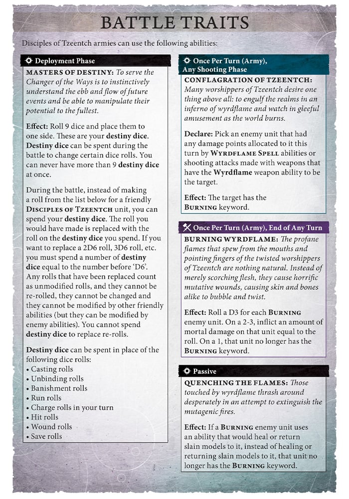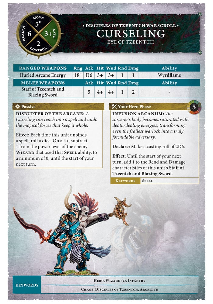 수많은 계획을 조율하면서 Tzeentch는 우주를 통제하는 운명의 실을 잡아당겨 자신에게 유리하게 운명을 조정하려고 시도합니다. 수백 년 전에 취해진 겉보기에 중요하지 않은 결정은 미래에 엄청난 영향을 미칠 수 있으며, 젠취의 제자들은 그들의 주인이 계속해서 엮어내지만 의문의 여지 없이 결실을 맺게 될 무한하고 복잡한 계획에 당황할 수 있습니다.