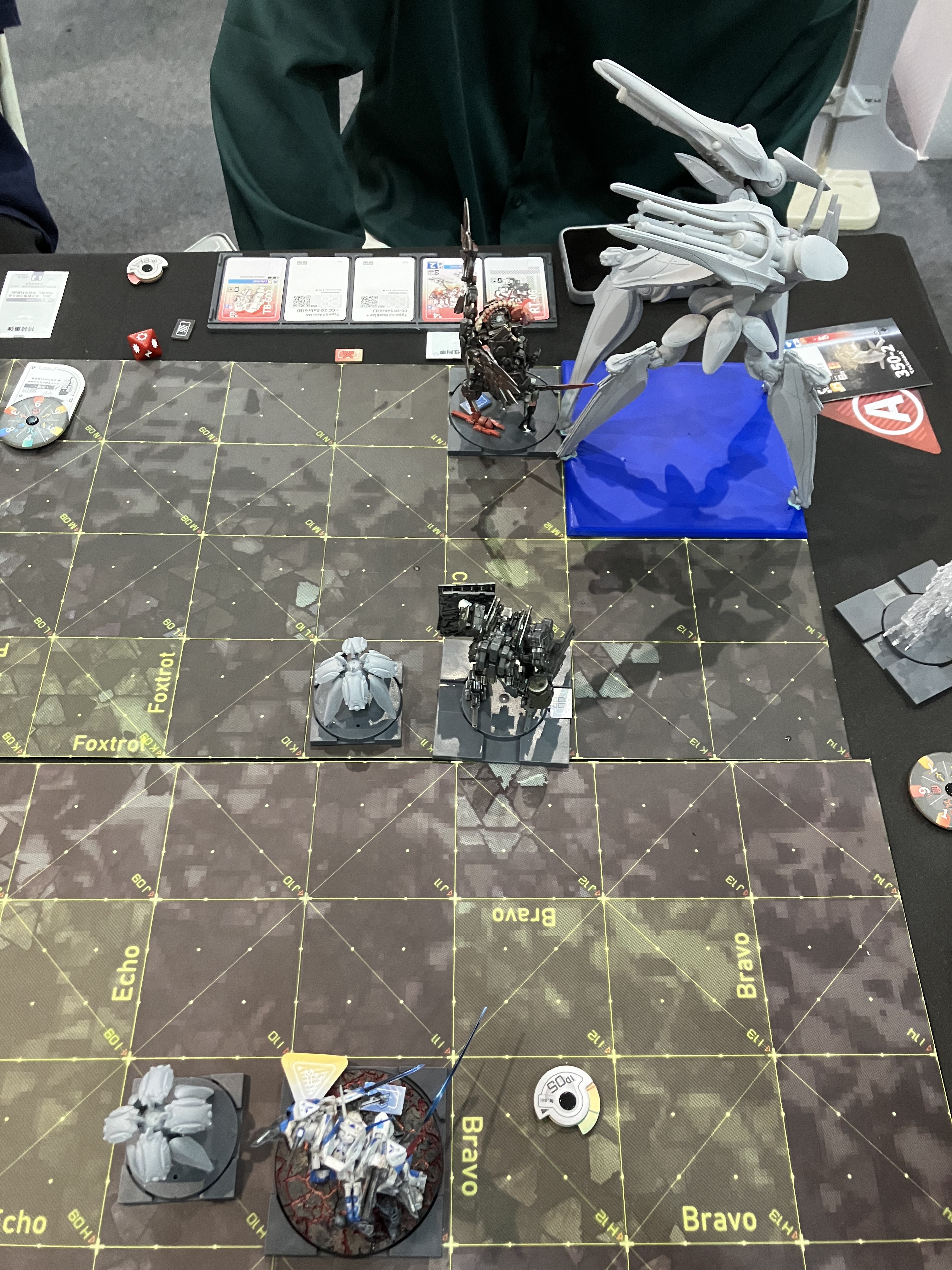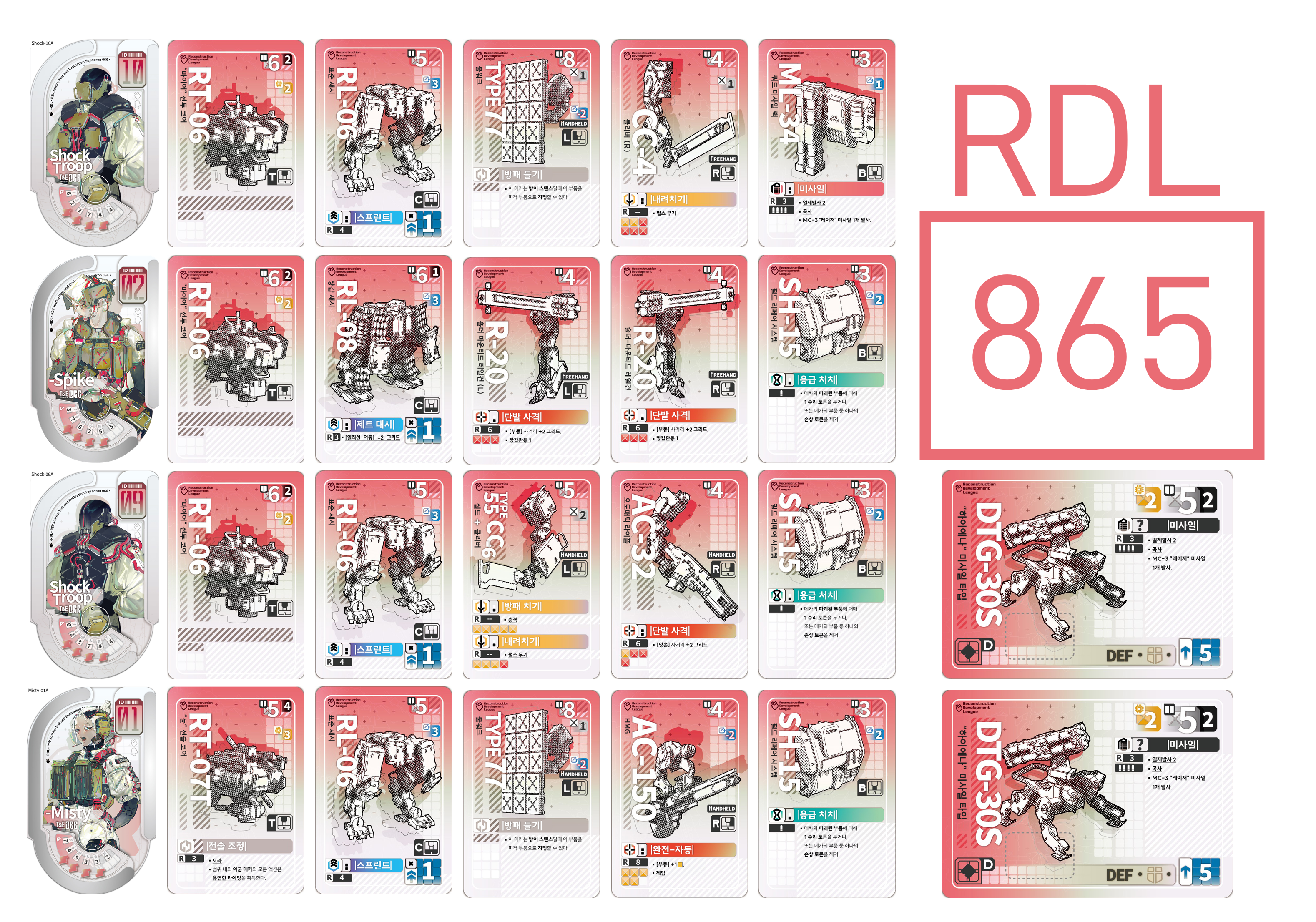 위 사진과 같이 각 부품별 카드와 여러 다양한 컴포넌트를 사용해 즐기는 게임으로, 부품뿐만 아니라 각 메카에 탑승한 파일럿마다 고유의 능력치가 따로 잡혀있어 파일럿조차도 하나의 선택지 요소가 됩니다.
