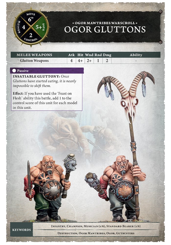 오거는 만족할 줄 모르는 식욕을 지닌 거대한 짐승이며, 배회하는 아부족은 다른 모든 부족, 사람, 국가를 이제 막 소비되기를 기다리는 영양분의 원천으로 여깁니다. 이 탐욕스러운 소비에는 종교적 우위가 있는데, 이는 모우 트라이브가 꿀꺽 삼키는 신에게 경의를 표하는 잔치를 벌이기 때문입니다. 다른 사람들은 그들을 단순히 게걸스럽게 먹어치우고 파괴하는 모든 것을 집어삼키는 괴물로 여길 수도 있지만, 워글럿과 올프로스툰은 갑옷과 무기를 만들고, 부족 정치에 참여하고, 용병 계약을 이행합니다. 그들은 심지어 약탈하거나 거래된 흑색 화약 무기를 유지하고 사용하여 (미묘하긴 하지만) 파괴적인 효과를 냅니다.