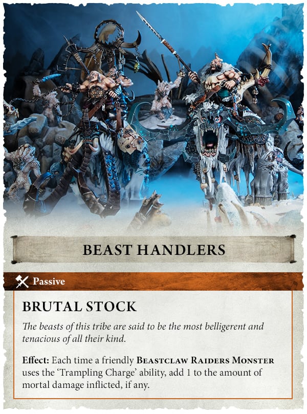 아군 비스트클로 레이더스 몬스터가 '짓밟는 돌격' 능력을 사용할 때, 입히는 모탈 데미지 총량에 +1 (피해를 입힐 경우에만)