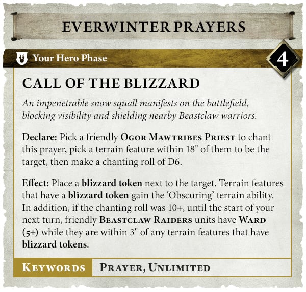 만약, 영창 굴림값이 10+이라면, 다음 내 턴이 시작할 때까지, 눈보라 토큰을 가진 지형 3" 이내의 아군 비스트클로 레이더스 유닛들은 와드(5+)을 가진다.