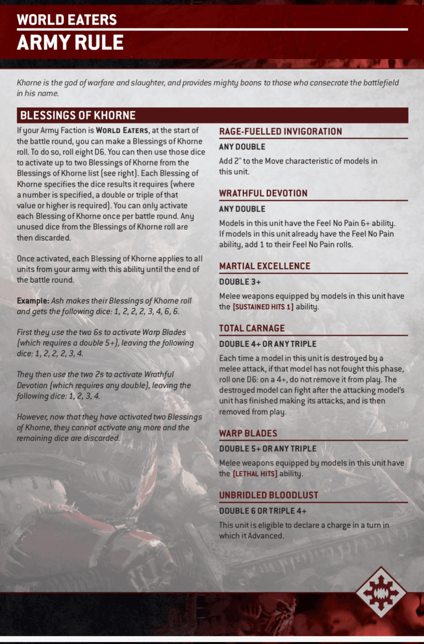 매 라운드마다 D6 8개를 굴리고, 주사위 굴림 결과에서 조합을 만들어 아미의 월드 이터 유닛에게 버프를 제공합니다.