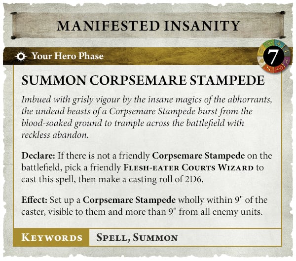 아군 콥스메어 스탬피드가 전장에 없을 때, 아군 플레시이터 코트 위자드를 하나 선택하여 이 주문을 시전할 수 있고, 2D6을 굴려 시전한다.