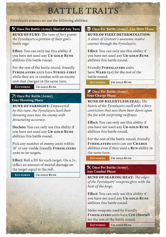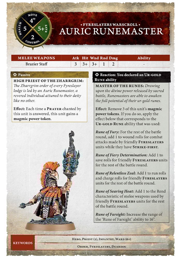 그들의 Zharrgrim 대장간 사제들은 우르-골드를 가공하여 힘의 룬을 만들고, 이 룬은 더 많은 신성한 금속을 모으려는 여정에서 그들을 보호하기 위해 동족의 살에 박혀 있습니다. 일단 깨어난 이 룬은 그림니르의 힘과 불카트릭스의 불을 집중시켜 파이어슬레이어들의 눈을 빛나게 하고 피부를 그을리게 만드는 광포한 분노로 몰아넣습니다.