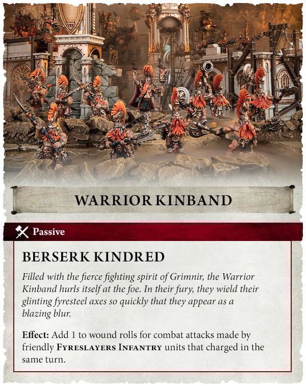이번 배틀 라운드 동안, 아군 파이어슬레이어 유닛들은 이번 턴에 돌격한 적 유닛이 교전 범위 이내에 있을 때, 스트라이크-퍼스트 효과를 받는다.