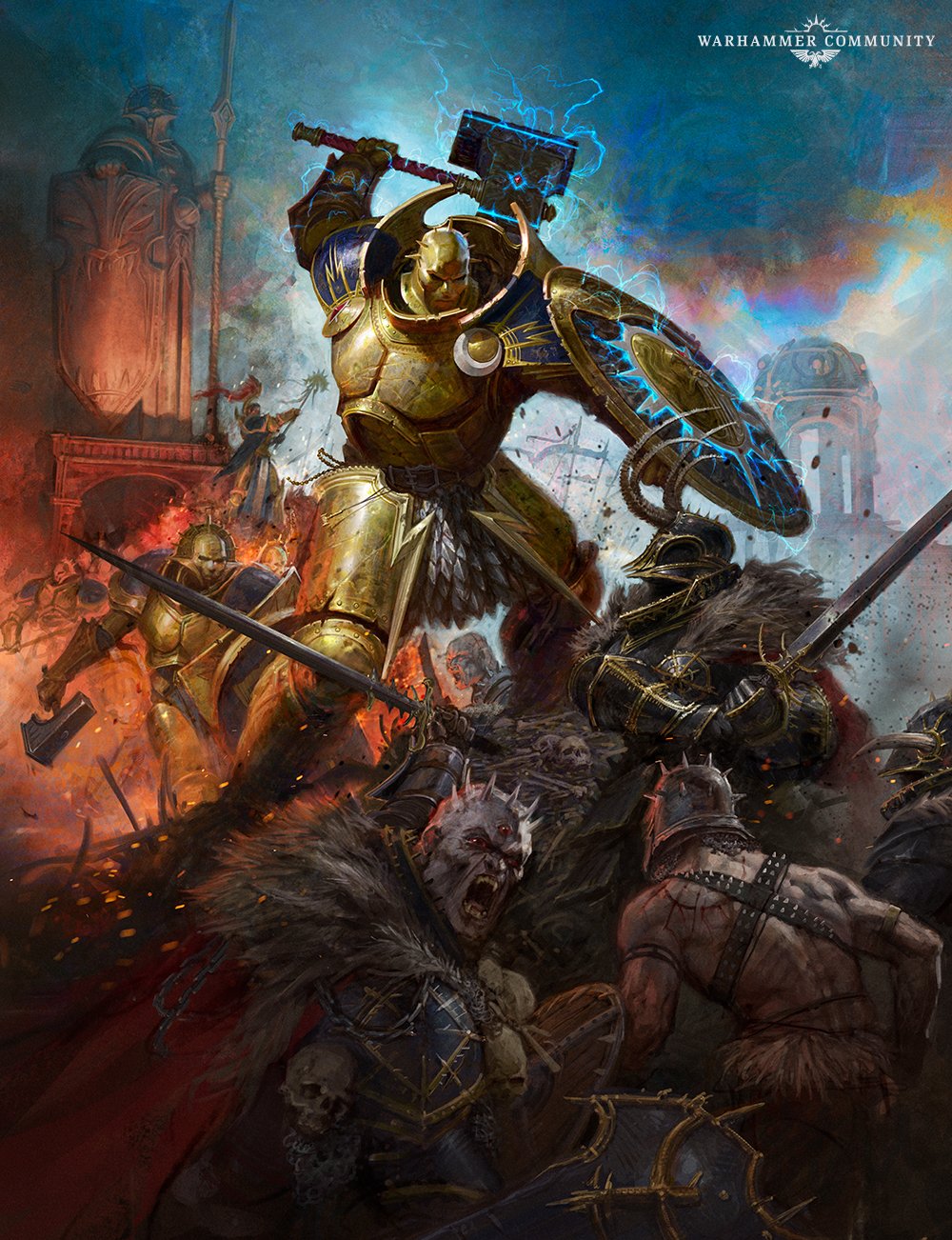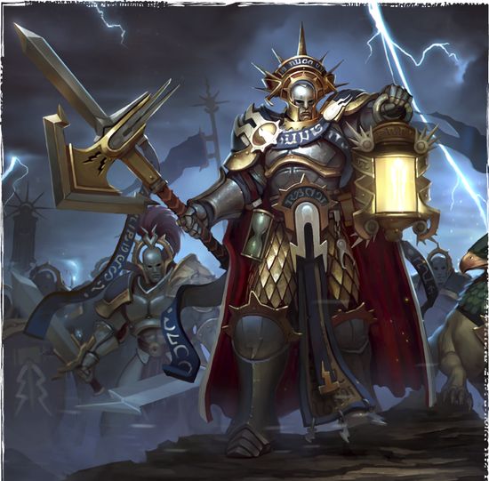 여섯 번째로 창설된 카오스의 침공에서 가장 많은 피해를 입은 영혼들로 구성된 스톰호스트로 무모하다고도 할 수 있는 용기로 유명하다. 카오스가 벌이는 잔악행위에 상상하기도 어려운 상처를 입은 이 전사들은 복수의 화신이자, 살아있는 분노라 말할 수 있다. 암울한 전쟁 성가와 함께 행군하는 셀레스티얼 빈디케이터의 성전군은 자비도 자제도 모르며, 필멸의 영역에서 카오스의 흔적을 지워버리기 위해 싸운다. 말 그대로 주변을 불태우는 이들의 분노와 죽음조차 두려워하지 않는 성향이 결합되어, 이들의 돌격은 파괴적인 파도처럼 적을 부숴버린다. 문화적으로 이들은 자기 스스로를 '지그마의 검'이라 여기고, 고대의 12개 룬검에서 비롯되었다는 '검의 아버지'를 섬겨, 검을 무장으로 좀 더 선호하는 경향이 있다.