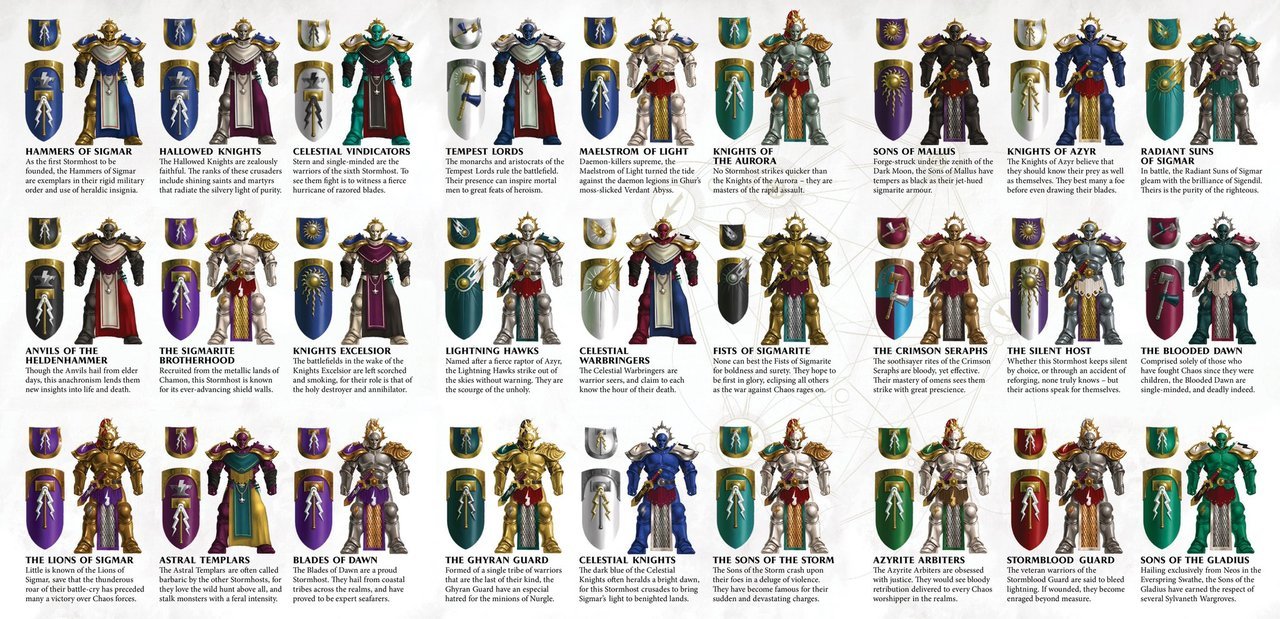 여섯 번째로 창설된 카오스의 침공에서 가장 많은 피해를 입은 영혼들로 구성된 스톰호스트로 무모하다고도 할 수 있는 용기로 유명하다. 카오스가 벌이는 잔악행위에 상상하기도 어려운 상처를 입은 이 전사들은 복수의 화신이자, 살아있는 분노라 말할 수 있다. 암울한 전쟁 성가와 함께 행군하는 셀레스티얼 빈디케이터의 성전군은 자비도 자제도 모르며, 필멸의 영역에서 카오스의 흔적을 지워버리기 위해 싸운다. 말 그대로 주변을 불태우는 이들의 분노와 죽음조차 두려워하지 않는 성향이 결합되어, 이들의 돌격은 파괴적인 파도처럼 적을 부숴버린다. 문화적으로 이들은 자기 스스로를 '지그마의 검'이라 여기고, 고대의 12개 룬검에서 비롯되었다는 '검의 아버지'를 섬겨, 검을 무장으로 좀 더 선호하는 경향이 있다.