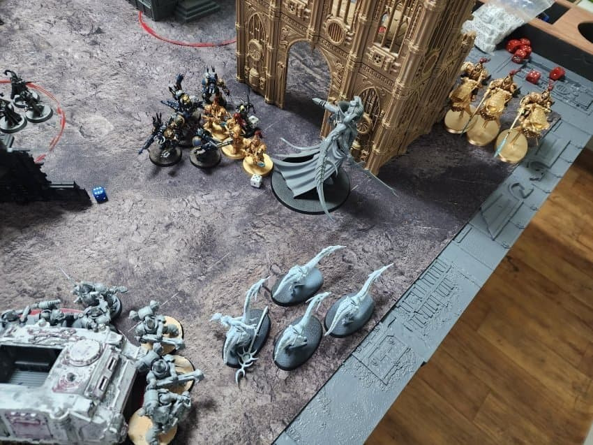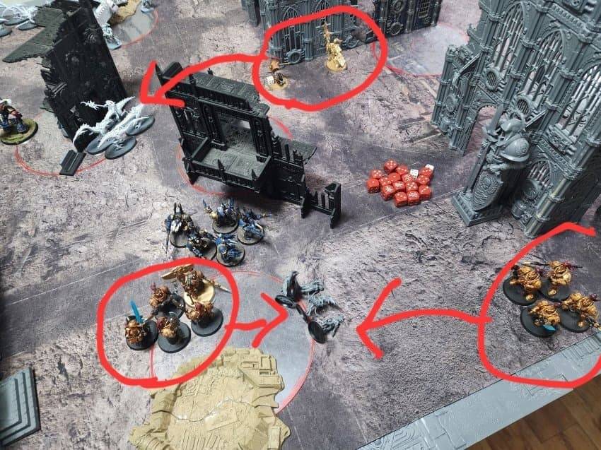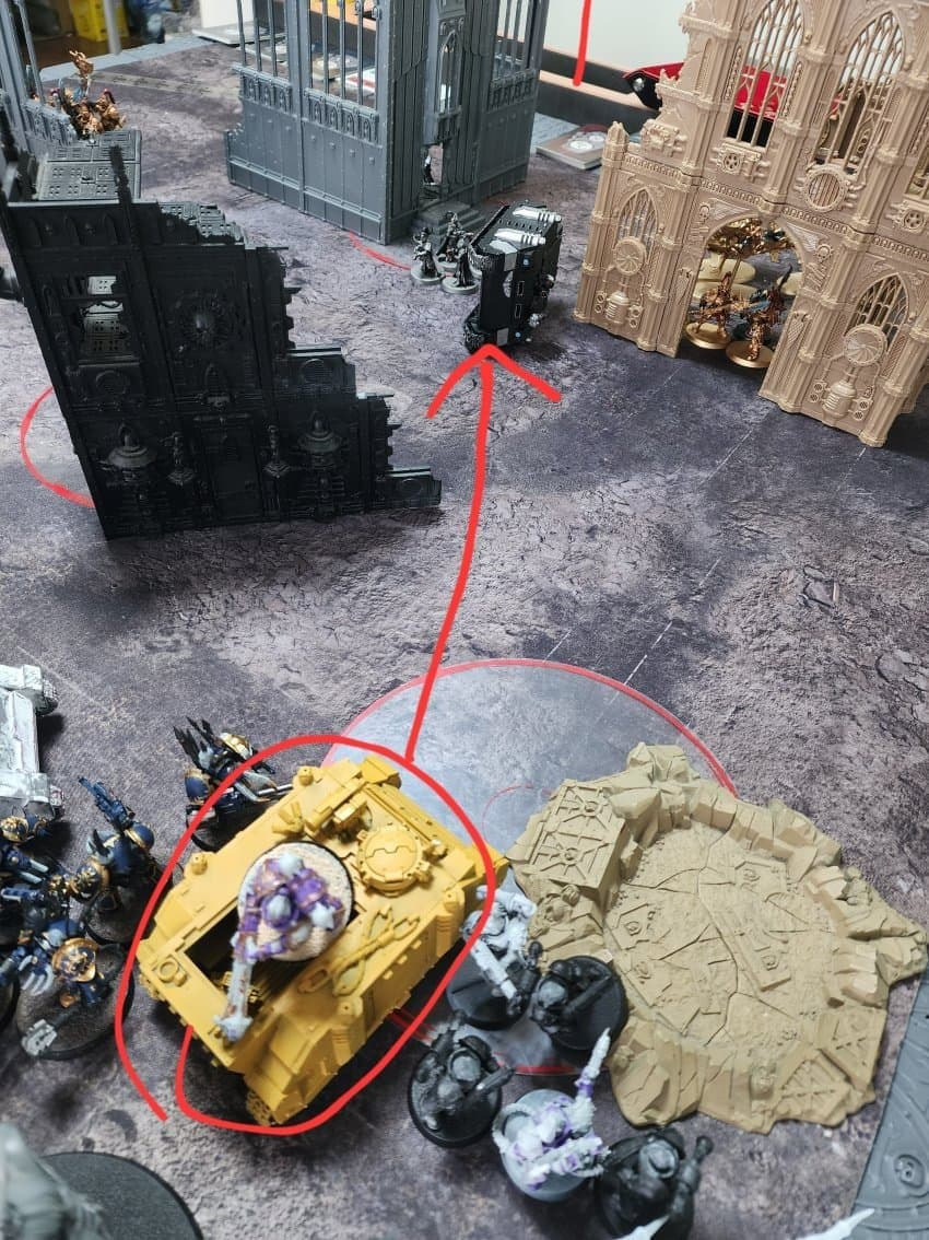 4. 노이즈 마린의 사격을 피하기 위해 뒤로 빠진 쉴드 캡틴(도끼) + 알라루스 2인 분대가 사격으로 라이노를 정리,