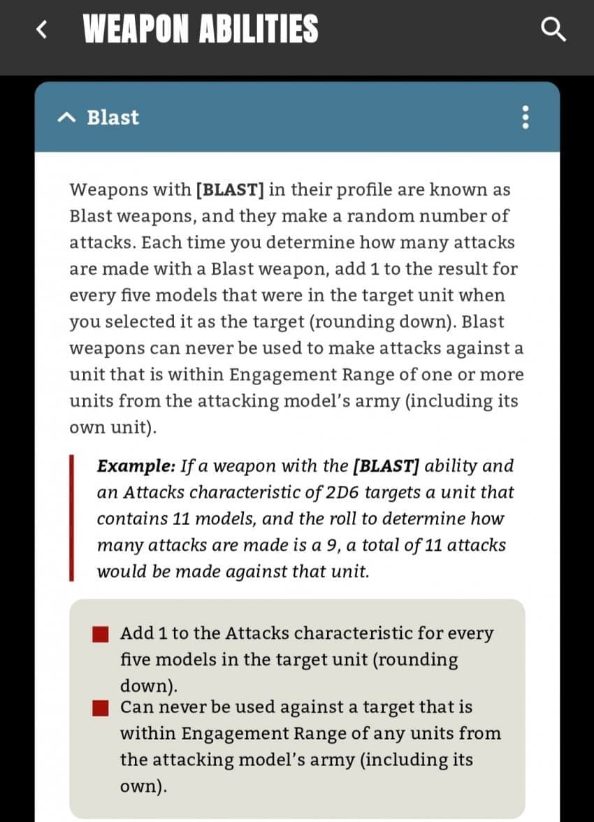 * 블라스트 : 이 무기는 상대 유닛을 공격할 때 모델 5기 당 공격 횟수를 1씩 더해서 공격합니다.