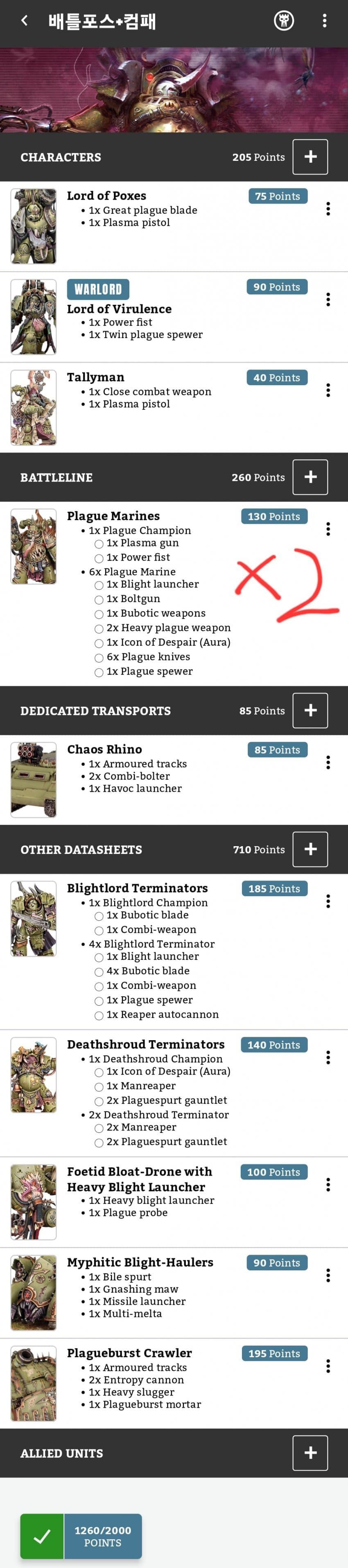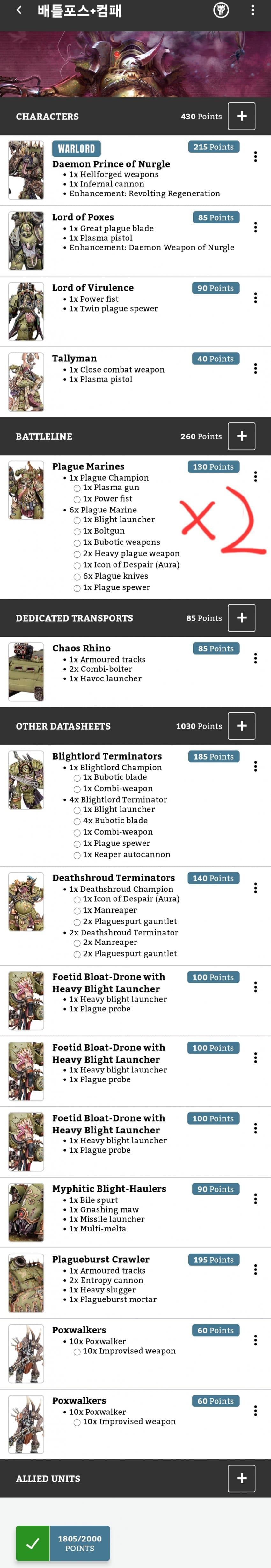 플레이그 마린, 터미네이터, 날드론 등을 통해 중보병 절대 죽여 로스터가 구성된 상황