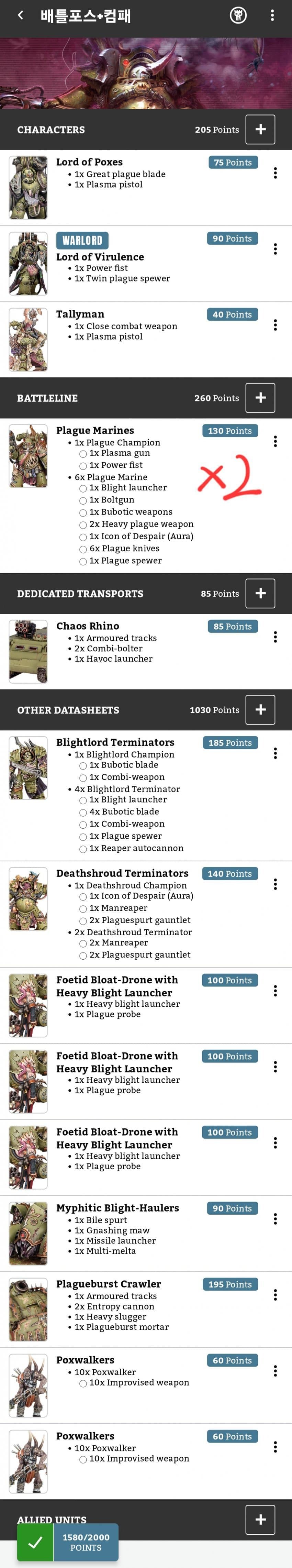 2. 보병을 견제하겠다 : 플레이그버스트 크롤러(195) / 데스슈라우드 3인(140) / 프레데터 디스트럭터(140, 부포 라스캐논 2문) / 플레이그 마린 추가