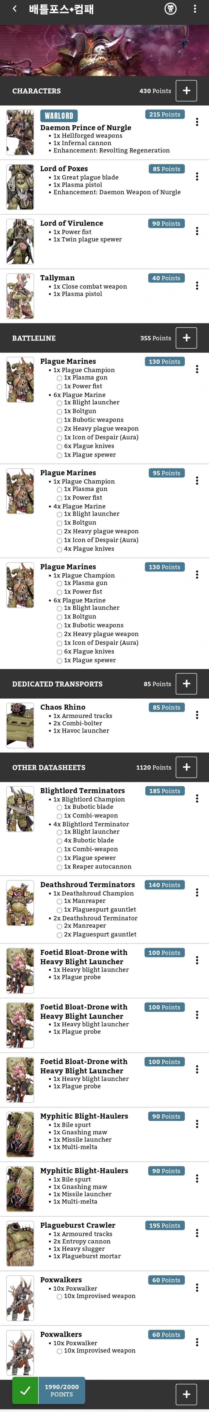 총 1990포인트의 아미 로스터를 완성했습니다.