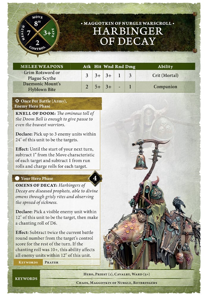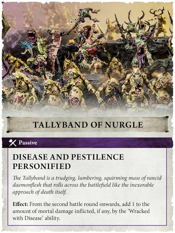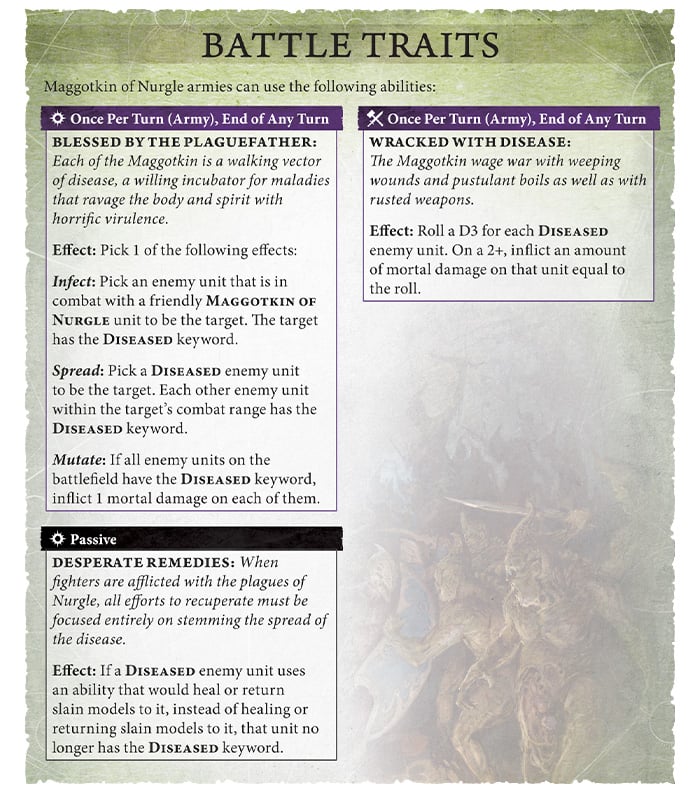 역병의 신은 질병으로 고통받는 사람들을 두 팔 벌려 자신의 무리로 환영하고, 그들이 간구하기만 하면 그들의 고통을 축복으로 바꿉니다. 일단 질병으로 약해진 곳에서는 썩은 살이 벗겨져 썩은 회복력으로 대체됩니다. 그 결과 그의 필멸의 군대는 초자연적으로 강력해졌습니다. 부패한 역병왕과 같은 적들은 느릴 수도 있지만, 두들겨 패는 것은 가능합니다.