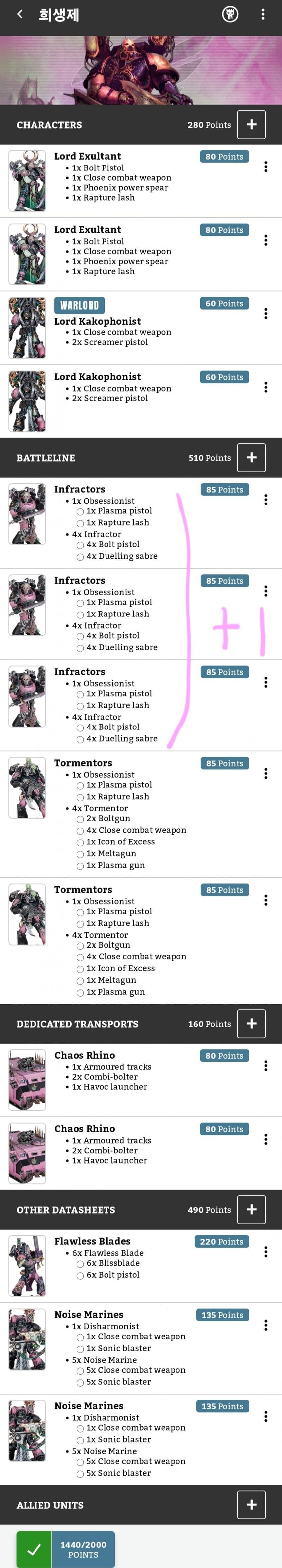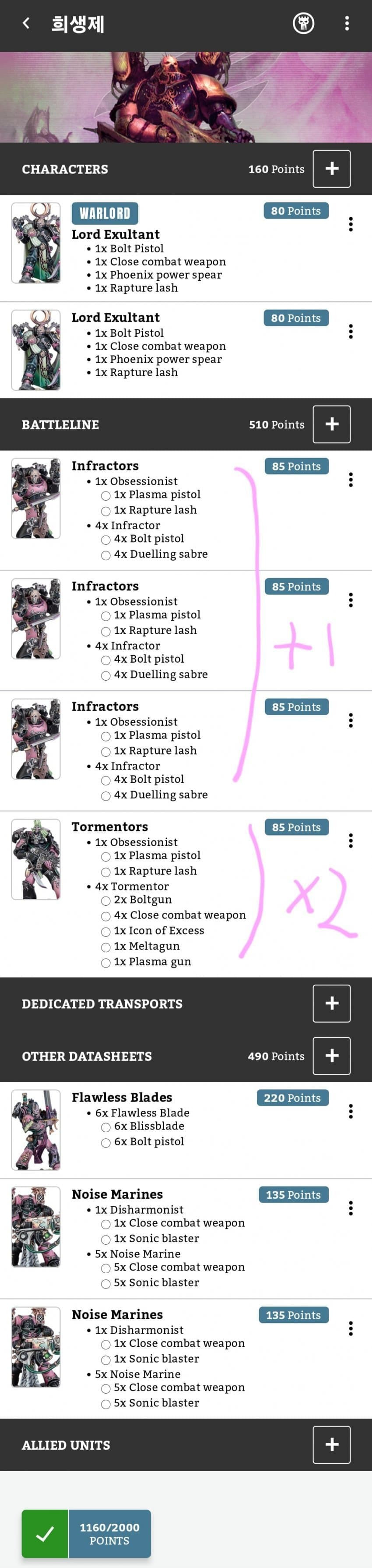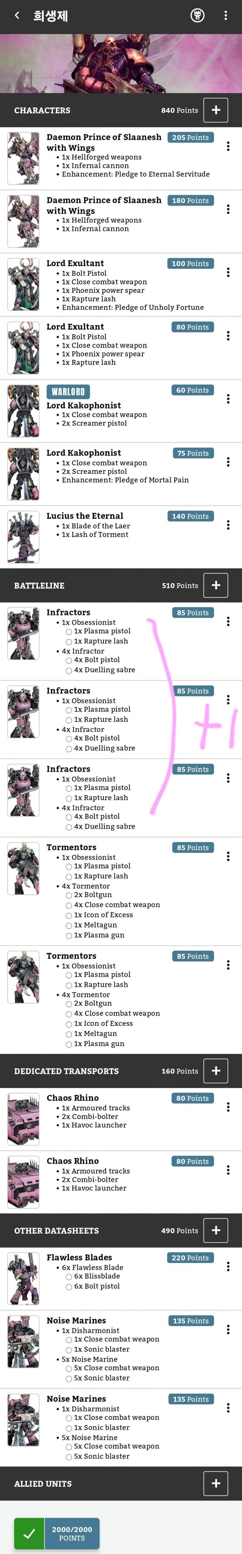 총 2000포인트의 로스터가 딱 알맞게 구성됐습니다.