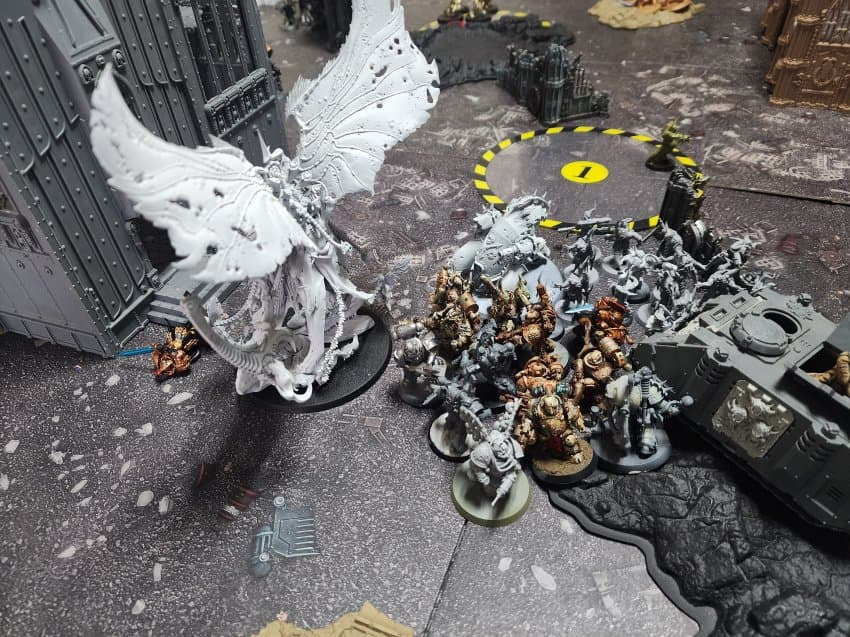 중앙과 우측은 모타리온 / 파이트 퍼스트가 달린(블라이트스폰) 플마 분대의 라이노 / 온갖 드론들이 밀집된 상황