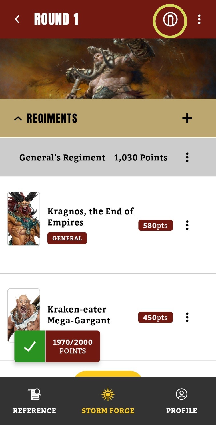 또 스톰 포지로 리스트를 작성한다면, 우측 상단 노란 원 안의 아이콘을 클릭하여 렐름게이트 기능을 사용할 수 있습니다. 렐름게이트는 해당 리스트가 각 페이즈 마다 사용하는 능력을 정리하여 한번에 확인할 수 있게 만들어줘 편의성이 매우 뛰어납니다.