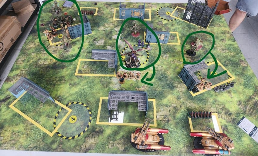 다음으로 트라잔 + 가드 분대를 데스 가드의 배치지역 마커인 1번 마커에 딥 스트라이크,