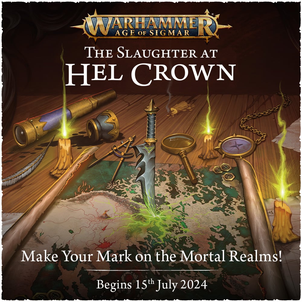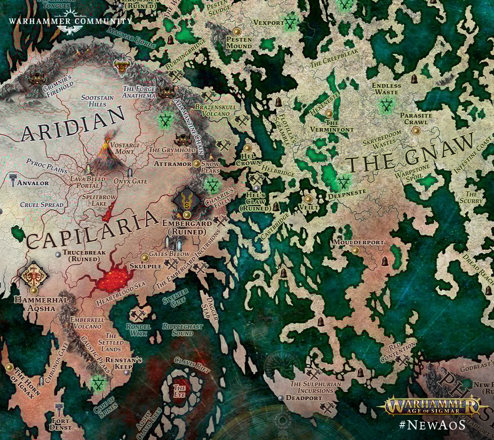아쿠시 그레이트 파치 대륙의 아다만틴 사슬 산맥과 더 나우 사이에 위치한 질서 대동맹의 핵심 요충지 '헬 크라운'을 두고 벌어지는 접전. 카오스 렐름으로 향하는 렐름게이트가 위치해, 코른 군세가 오랜 시간 장악하고 있던 헬 크라운은 겨우 3년전 막대한 희생 끝에 정복하는데 성공한 지점이나, 버민둠 사태 이후로 스케이븐의 맹공이 가해지고 있음. 버민둠의 여파로 형성된 더 나우를 침공하기 위해서는 헬 크라운의 요새화된 항구가 절실한 만큼 질서 세력은 무조건 막아야 하는 거점이며, 스케이븐 입장에는 코 앞의 검이나 다름 없어 최우선 파괴 목표임.