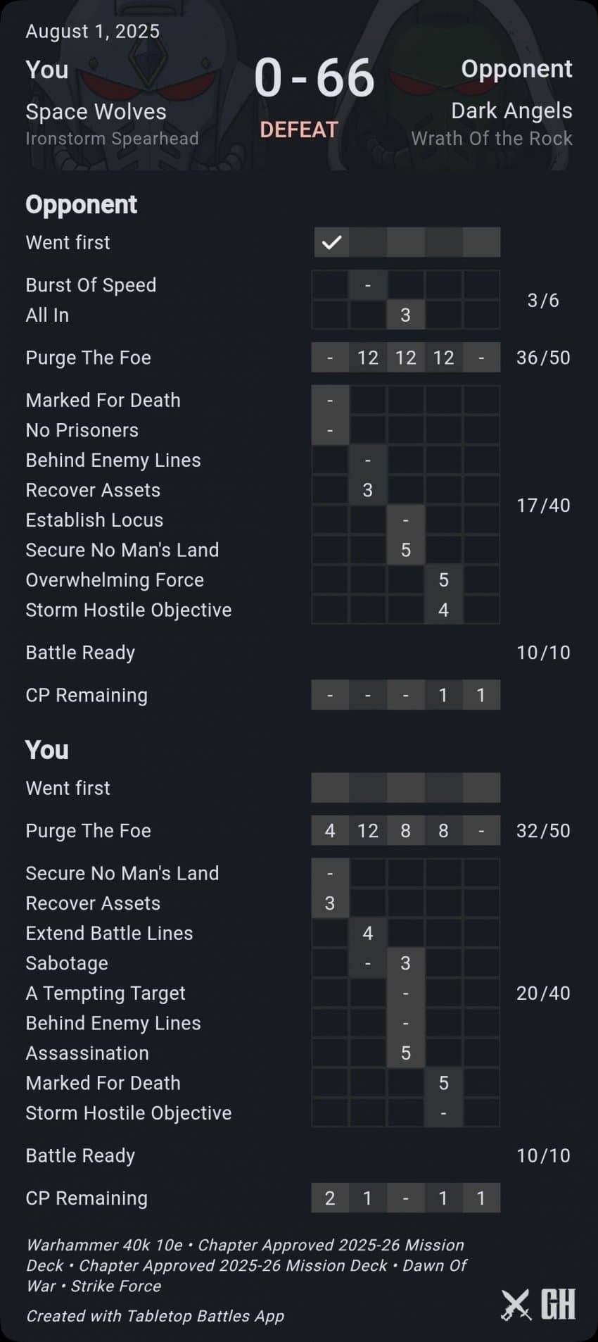 다크 엔젤 측이 드디어 4점 차로 스페이스 울프의 승점을 역전했습니다. (62 : 66)