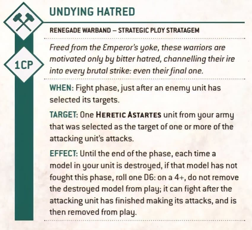 대상 : 아직 사격이나 파이트를 하지 않은, 당신 아미의 헤러틱 아스타르테스 보병 유닛 or 마운티드(기마) 유닛 하나