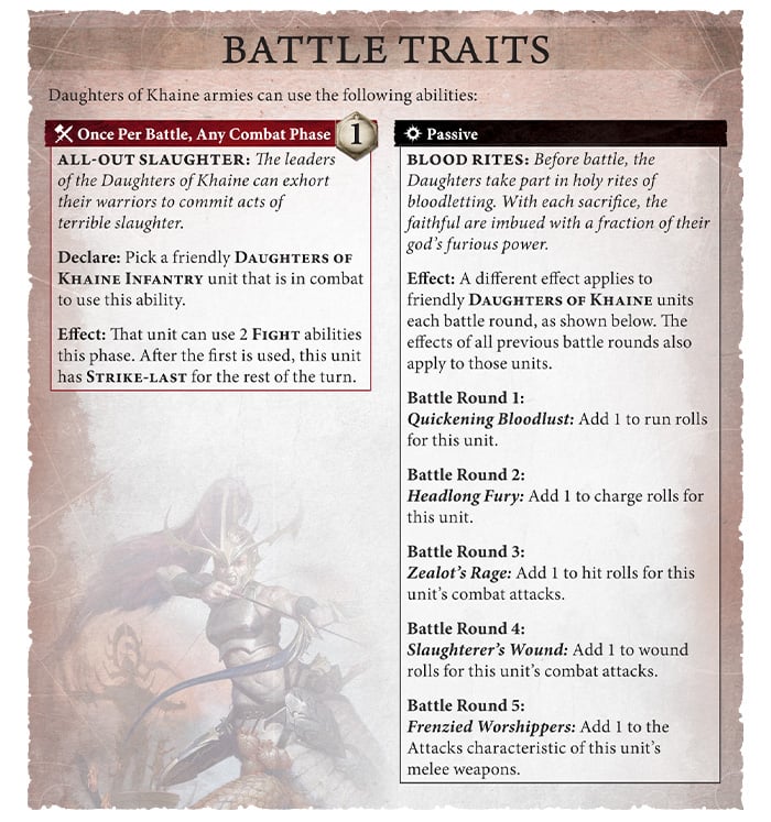 아군 도터즈 오브 케인 유닛들은 배틀 라운드에 따라 아래의 효과를 얻는다.