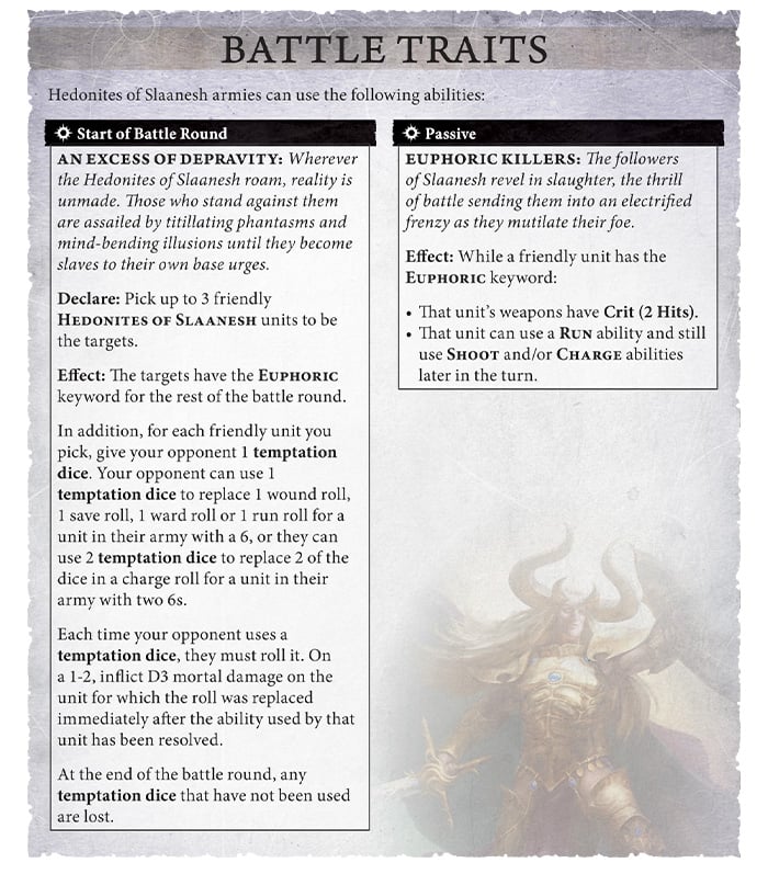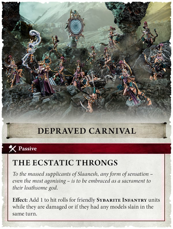 슬라네쉬의 헤도나이트가 피를 흘리며 적들이 합류하도록 유혹하는 곳에서는 현실의 벽이 무너지고 악마들이 카오스 영역에서 나옵니다. 매혹적인 데모넷은 먹이를 리본으로 자르는 동안에도 영원한 즐거움과 과잉을 약속하며, 우아한 칼날이 달린 바퀴로 연대 전체를 가르는 대형 전차에 올라타 질주합니다. 이들의 존재에서 비롯한 무절제한 방종은 전장을 환상의 낙원으로 변모시키며, 슬라네쉬가 마침내 역설의 감옥에서 풀려날 때 찾아올 황홀경과 폭력의 카니발에 대한 고통스러운 서곡입니다.