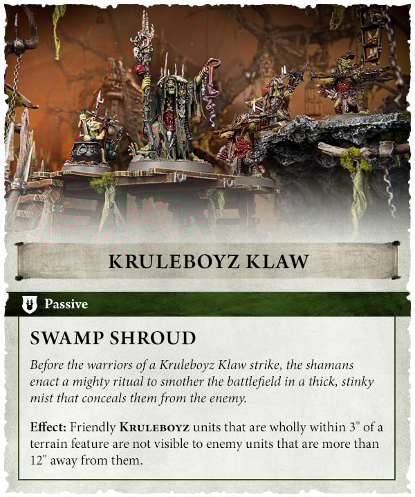 아군 크룰보이즈 유닛들은 지형 3" 이내에 완전히 들어가 있다면, 12" 이상 떨어진 적 유닛의 시야에 보이지 않는다.