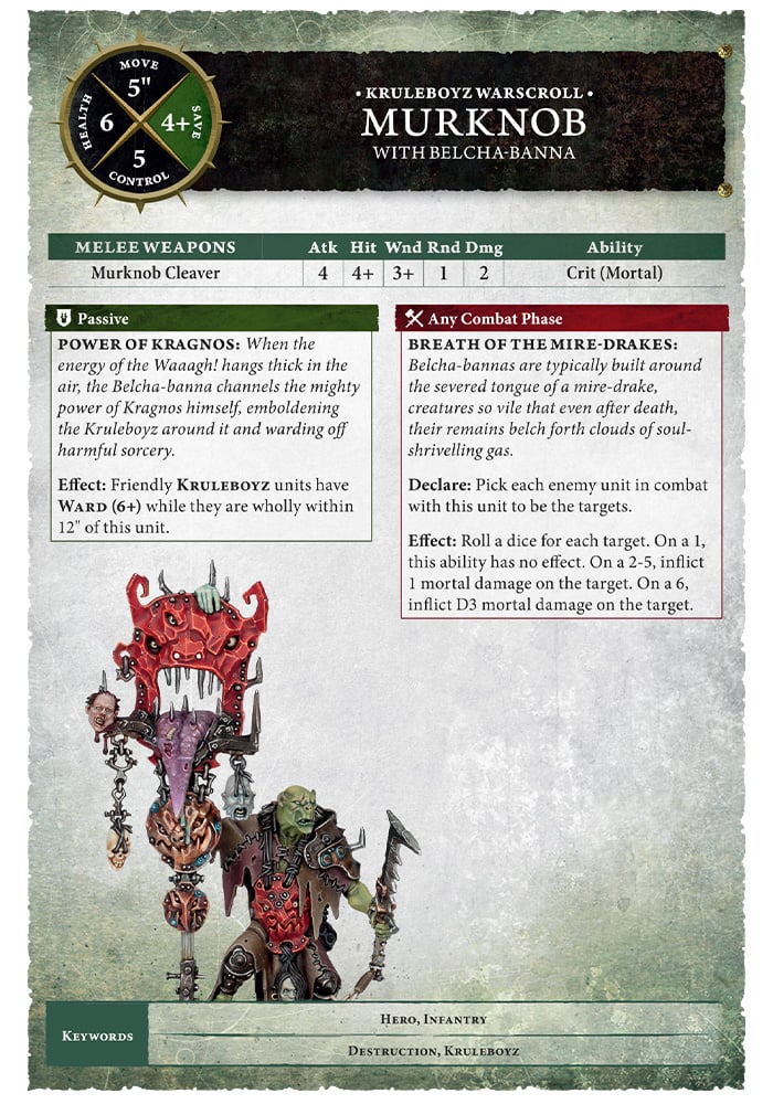 각 크룰보이즈 워클랜은 집착과 기여에 따라 정의되는 부족으로 구분됩니다. Badstabbaz는 비천한 말단부터 무시무시한 Murknobs까지 워클랜의 전사 클래스를 구성하고 Git-snatchaz는 사악한 인신매매의 전문가이며 Deffspikerz는 거만한 명사수입니다. 모탈 렐름의 늪에는 Great Gnashtoof 및 Sludgeraker와 같은 거대한 짐승들이 가득하며, Beast-breaka 부족은 그러한 괴물을 정복하는 방법을 배웠습니다. 그들을 자신의 의지에 구부리고 족장에게 넘겨 전투에 나섰습니다.