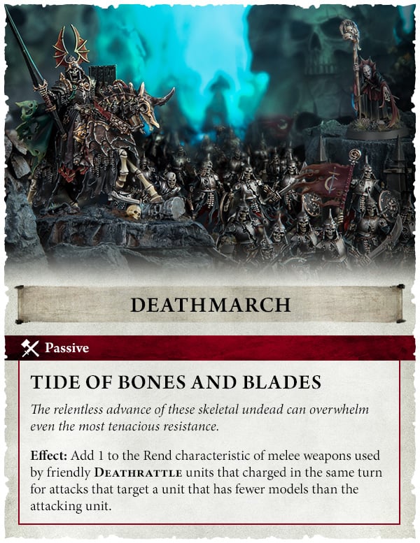 아군 데스래틀 유닛들은 돌격 한 턴 동안, 자신보다 적은 모델로 구성된 유닛을 대상으로 공격할 때, 근접 공격의 렌드 수치에 +1