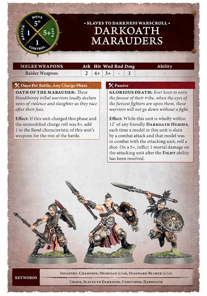 슬레이브 투 다크니스는 필멸의 영역의 진정한 상속자이며, 혼돈의 시대에서 살아남기 위해 파멸의 힘을 숭배하는 평범한 사람들의 후손입니다. 냉혹한 얼굴의 족장이 이끄는 Darkoath 부족부터 압제적인 군벌이 지휘하는 무장한 군대까지, Slaves to Darkness는 권력을 추구하여 영역을 무너뜨립니다. 그들의 목표는 간단합니다. 약한 자들과 거짓 신들을 타도하고 필멸의 영역에 대한 지배권을 주장하는 것입니다.