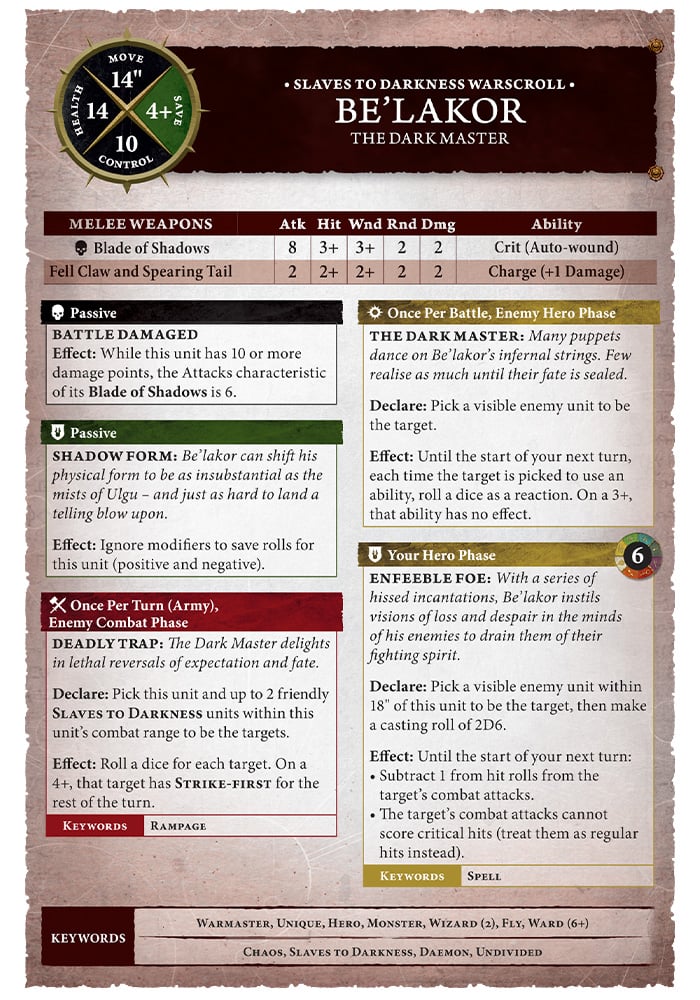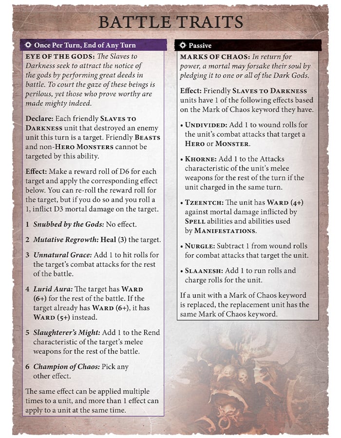 아군 슬레이브 투 다크니스 유닛들은 가지고 있는 카오스의 인장 키워드에 따라 다음의 효과를 얻는다.