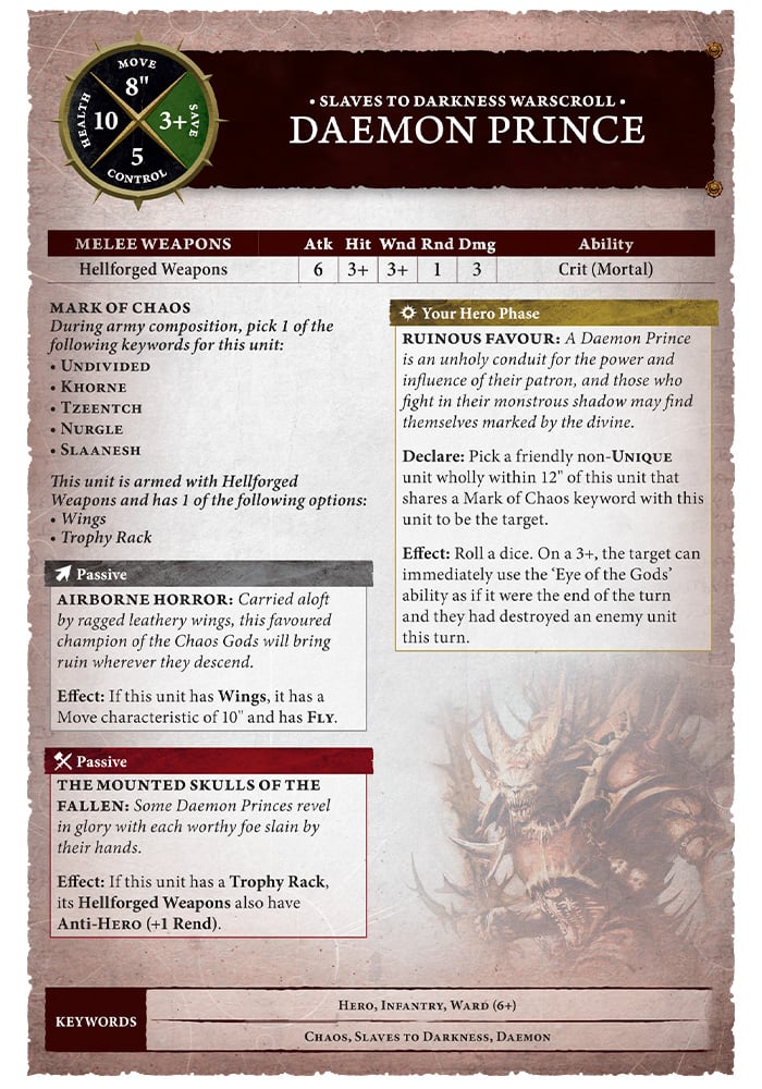 파멸의 힘은 승리한 자에게 강력한 힘을 선물로 보상하지만, 자신을 불쾌하게 만드는 자들을 뒤흔드는 돌연변이 덩어리로 만드는 일도 마다하지 않습니다. 그러나 진정으로 인내하는 선택된 소수는 우뚝 솟은 데몬 프린스, 전쟁에 굶주린 괴물이 되어 위대한 전쟁군의 지휘권을 부여받을 수도 있습니다.