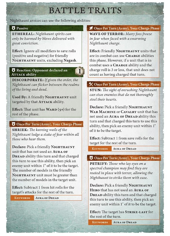 죽음의 오라 능력을 이번 턴에 사용하지 않았고, 이번 턴에 돌격한 아군 나이트헌트 워머신/기병 유닛을 선택한 후, 1" 이내의 적 유닛을 하나 대상으로 지정한다.