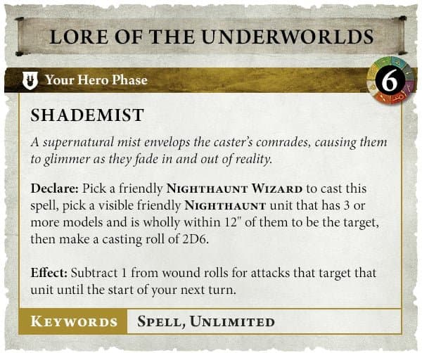 이 주문을 시전할 아군 나이트헌트 마법사를 하나 선택하고, 3 이상의 모델로 구성되었으며, 시전자 12" 이내에 완전히 들어간 시야에 보이는 아군 나이트헌트 유닛을 하나 선택한 뒤, 2D6으로 시전 굴림을 굴린다.