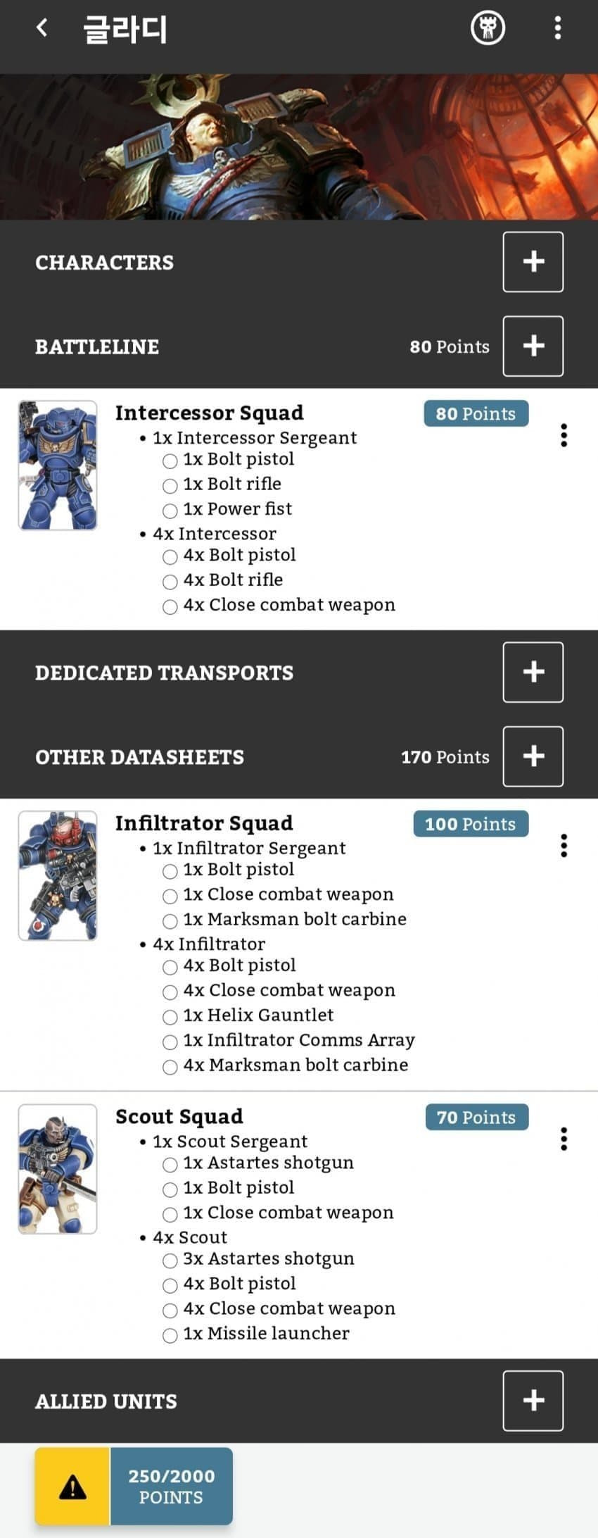 저는 항상 '최대 3개 유닛까지만, 300포인트를 넘기지 않는다'는 제 나름대로의 규칙을 가지고 로스터를 짜곤 합니다만,