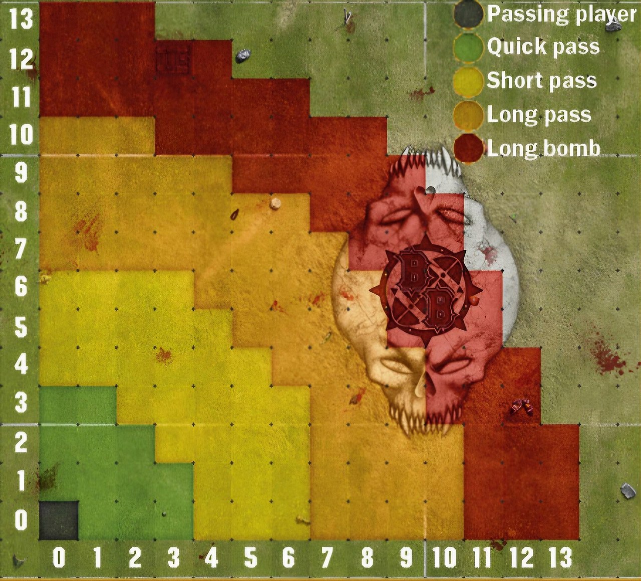 •매우 부정확한 패스(WILDLY INACCURATE PASSES):주사위 값이 수정값을 적용한뒤 1이 된 경우. 이때 공은 패스를 실행하던 선수의 칸에서 빗나갑니다(deviate-공이 d8방향으로 d6만큼 날아갑니다. 이때 일어선 선수가 없는칸에 떨어진 공은 bounce 됩니다).