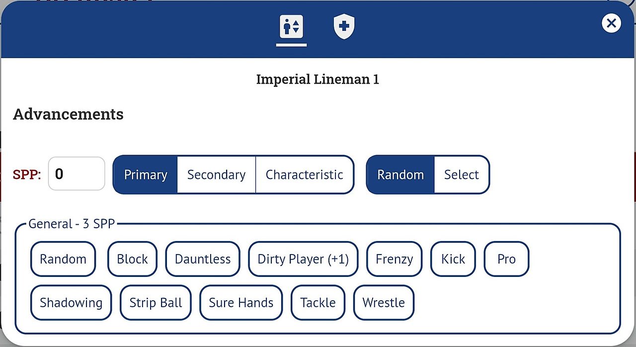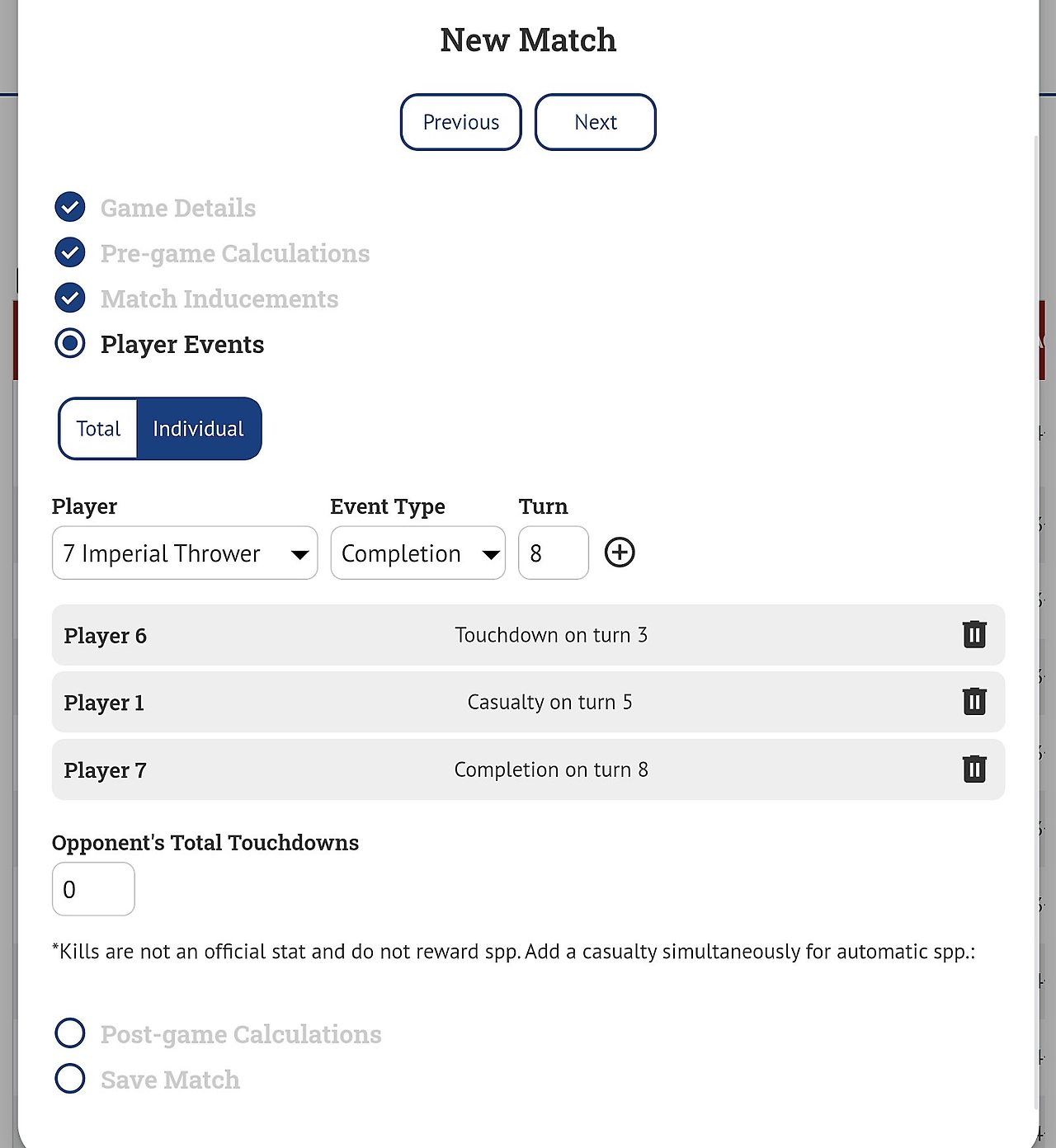 individual란에서 각 선수들이 매치중에 spp를 획득하는 이벤트를 기록합니다. 선수와 이벤트 타입, 그 이벤트가 발생한 턴을 기록해 +버튼을 누릅니다. 이벤트 타입에는 터치다운, 패스성공(completions), 부상입히기(casualties), 적 살해(kills), 가로채기(interceptions), 방해하기(deflections)이 있습니다.