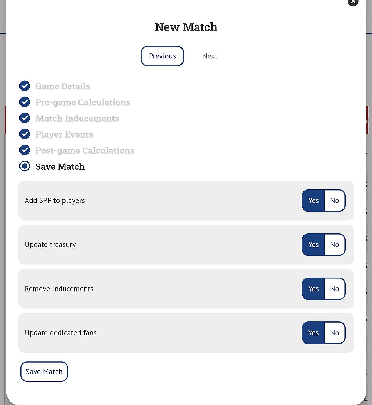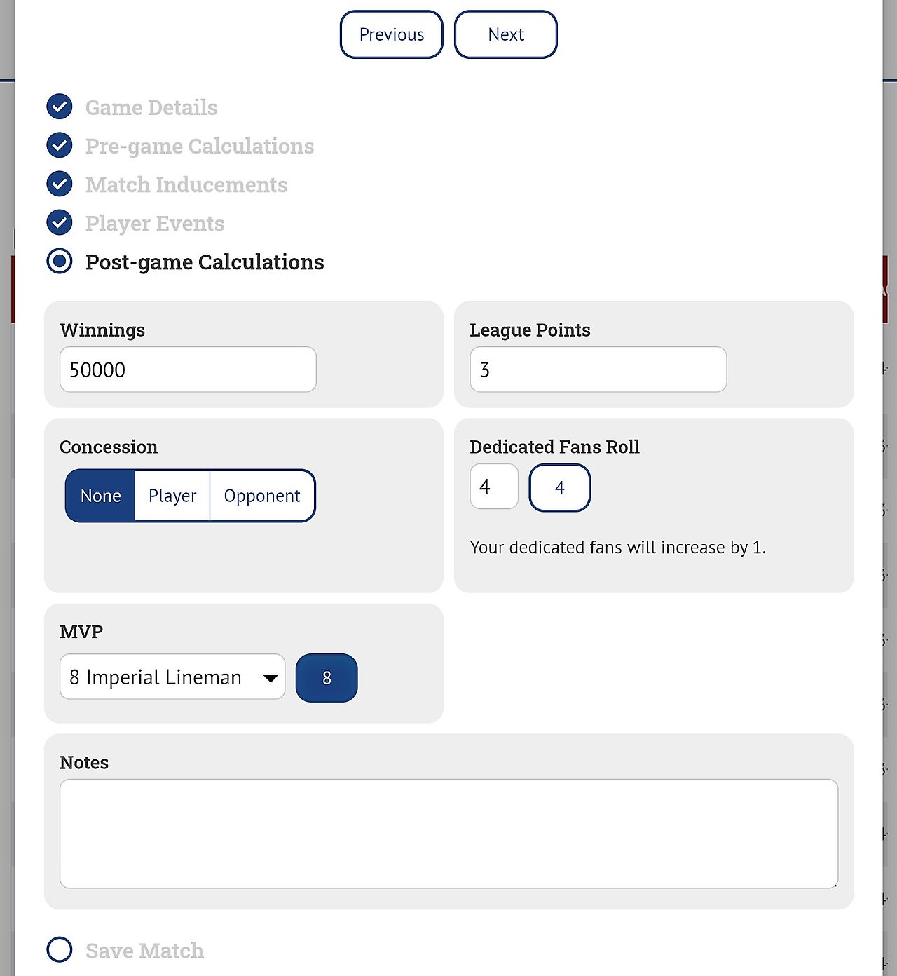 경기종료후 정산입니다. 양팀의 팬팩터와 당신의 터치다운을 계산해 위닝 금액이 결정됩니다. 종종 계산이 안맞는 경우가 있으니 한번 더 확인 후 직접 수정하셔도 됩니다. 승패에 따라 리그내 승점인 리그포인트를 기입합니다. 이후 항복 여부를 체크한뒤 열성팬의 증감을 테스트합니다. 마지막으로 mvp를 선정합니다.