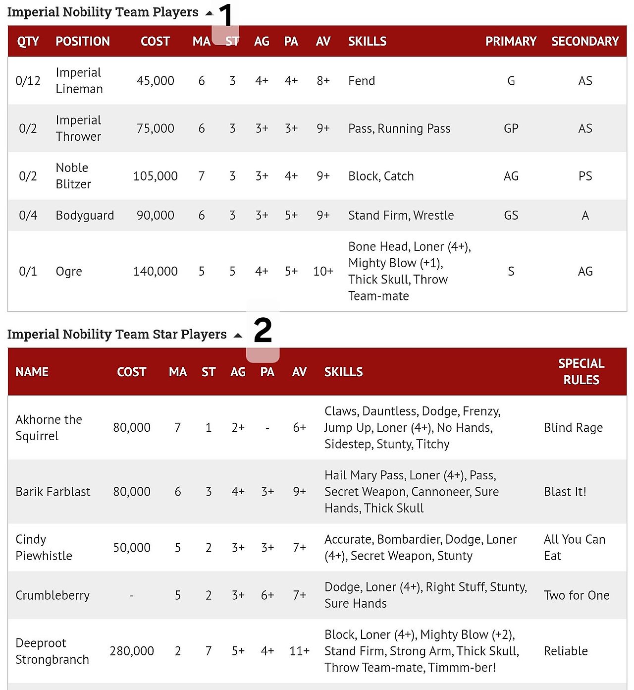 4.블러드보울의 모든 팀들입니다. 팀 이름옆에 I, II, III은 각 팀의 공식 티어를 의미합니다.
